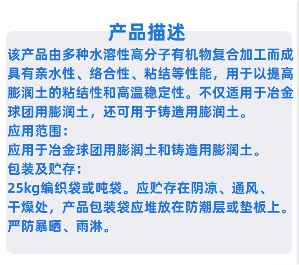 產品介紹:該產品由多種水溶性高分子有機物復合加工而成。具有親水性、絡合性、粘結等性能,用于以提高膨潤土的粘結性和高溫穩(wěn)定性。不僅適用于冶金球團用膨潤土,還可用于鑄造用膨潤土。應用范圍:應用于冶金球團用膨潤土和鑄造用膨潤土。包裝及貯存:25kg編織袋或噸袋?!?/p>